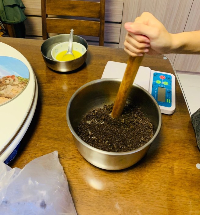 壓碎完餅乾便是一邊攪拌一邊到入牛油。