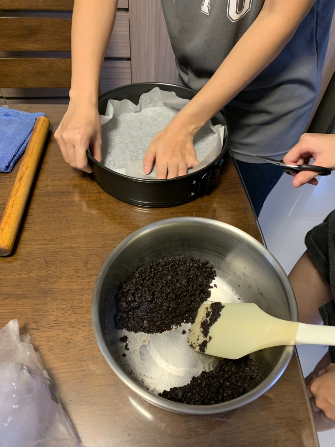 起先我們先壓碎餅乾,然後在蛋糕烤盤上鋪上烘焙紙