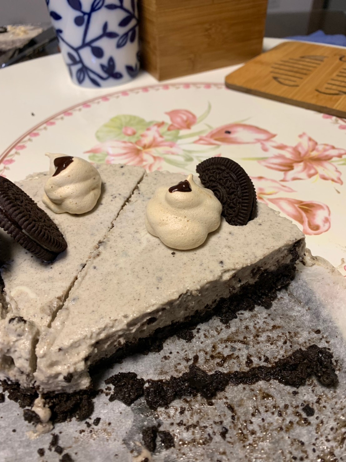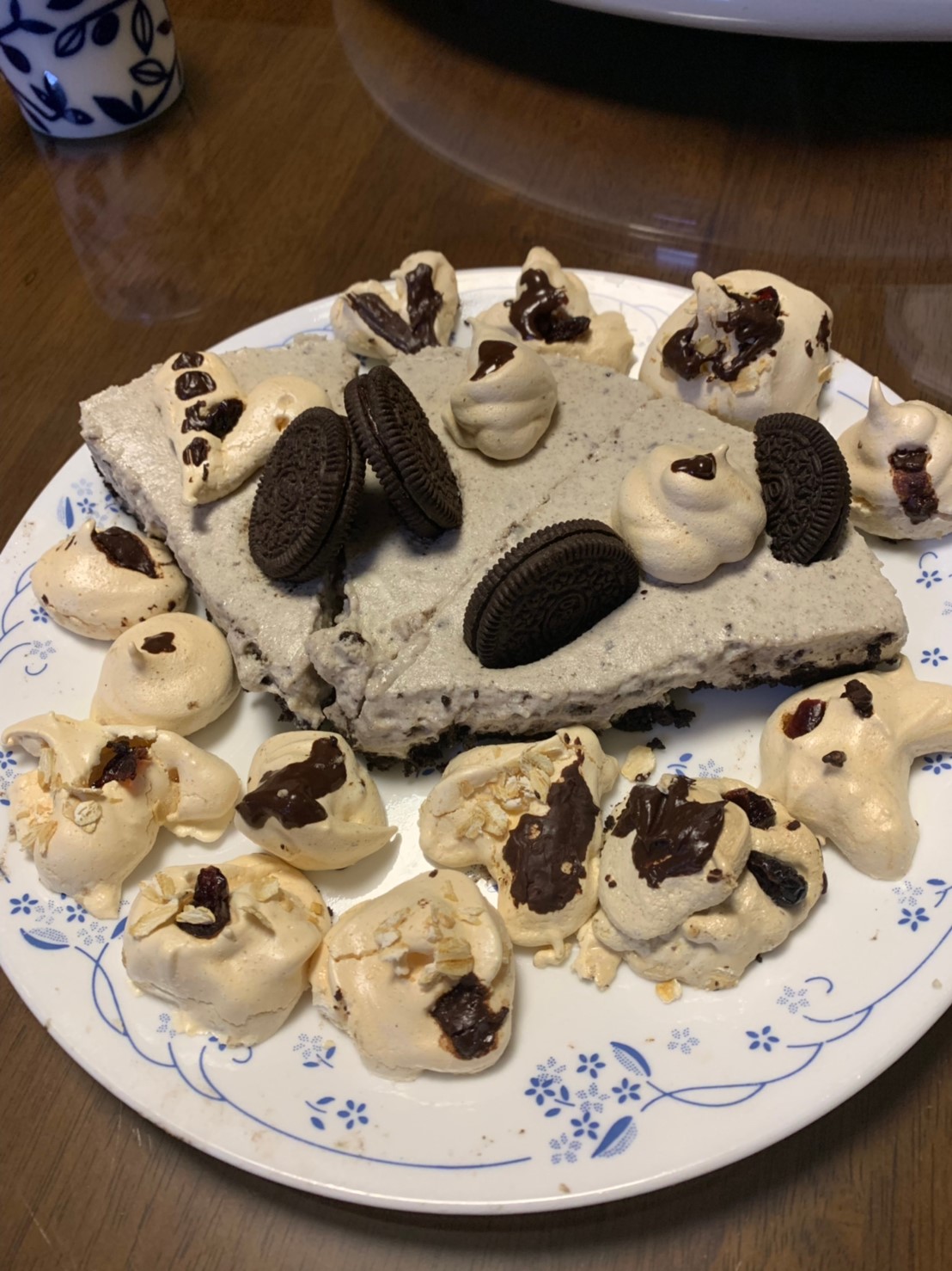 把蛋白餅跟oreo餅乾擺上去裝飾一下,我們的oreo乳酪起士蛋糕就算完成啦(灑花