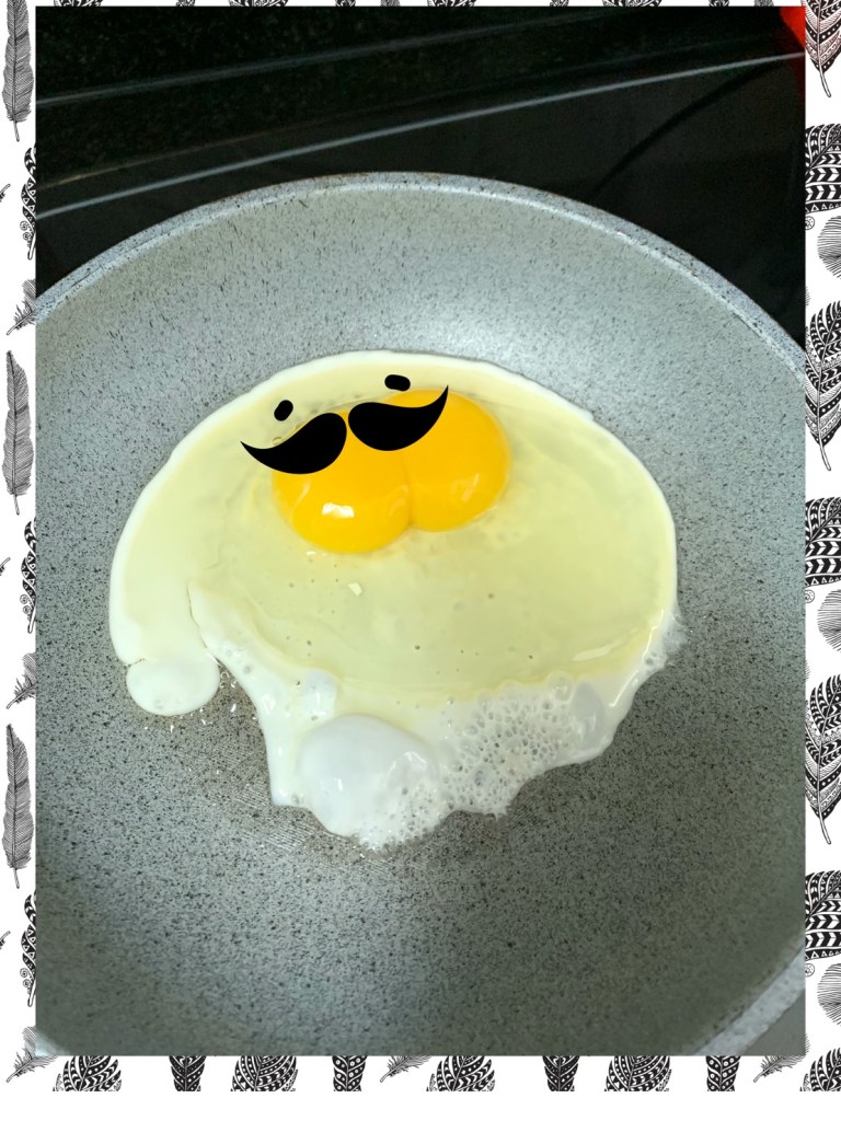 隨後,拿起擱在一旁的蛋,扣地一聲,掉入預熱鍋中