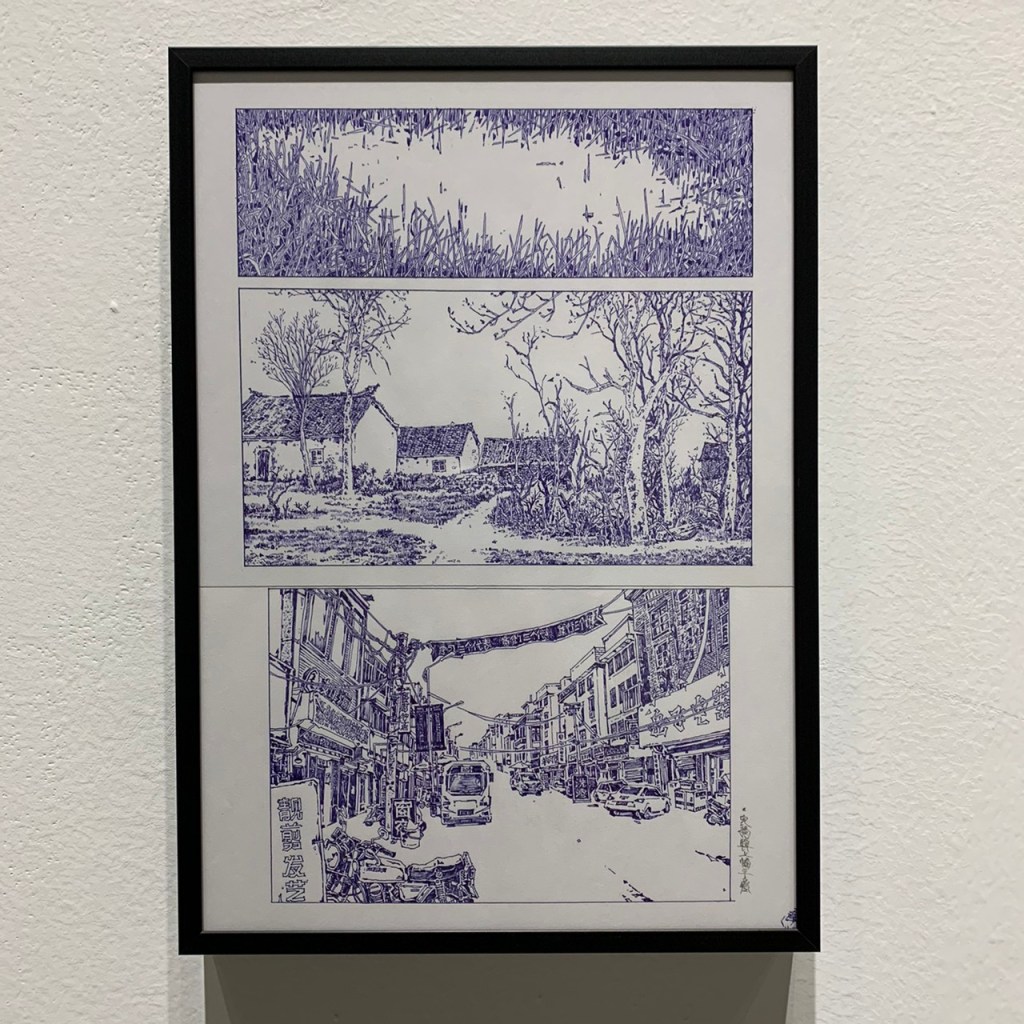 作品呈現有插畫也有紙雕,主題主要說的是馬來西亞的民俗文藝以及生活樣貌,我很喜歡他的紙雕呈現方式,放在一個半圓形的透明罩子裡,用放大鏡細細品味,別是另一番風味。