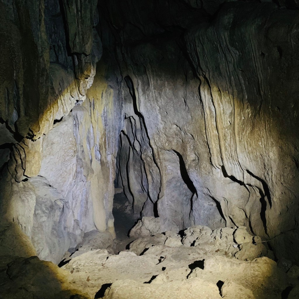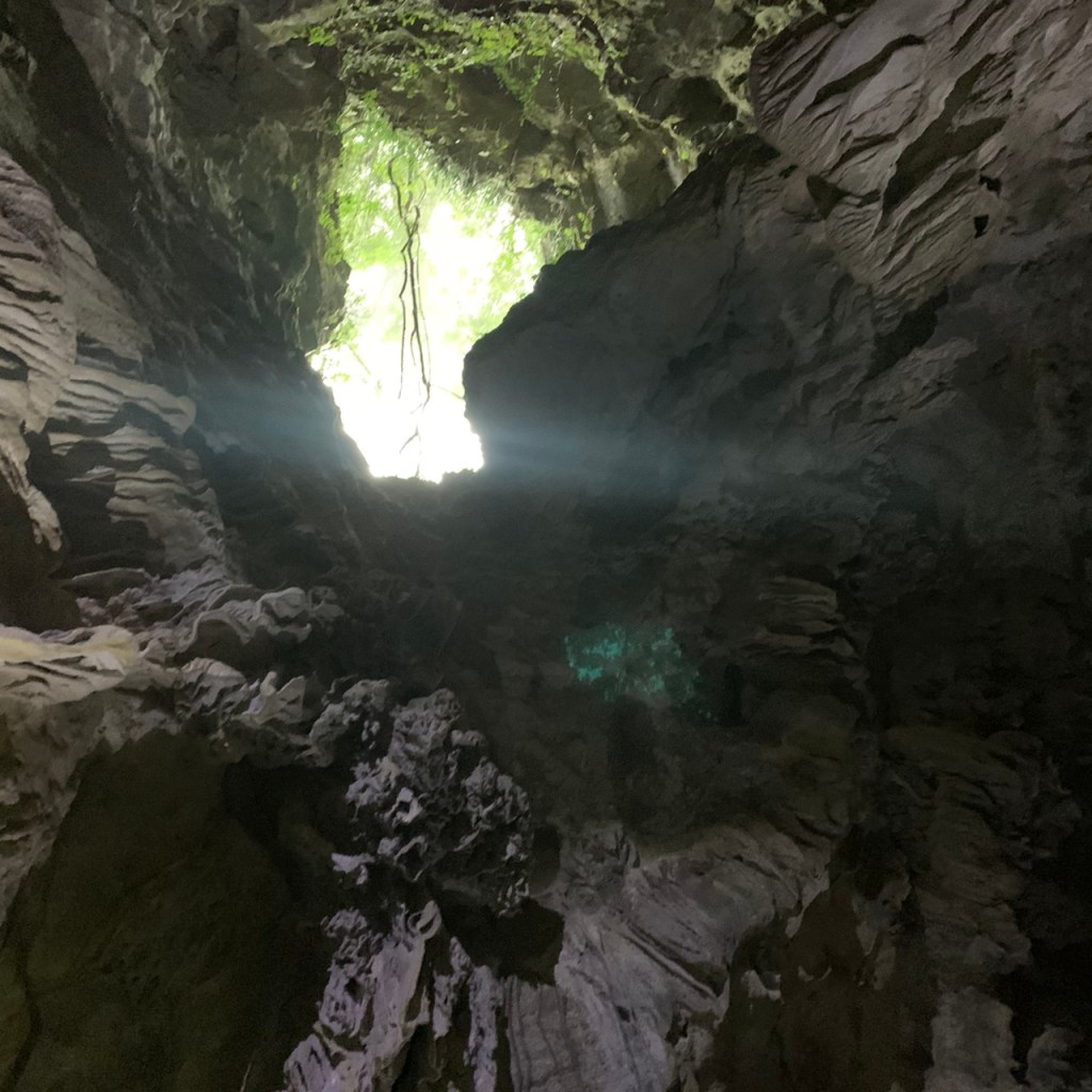 我們第一個進去的是天雨洞,顧名思義就是有個天窗的洞穴,如此簡單易懂,洞裡的有很多高低,怕我們撞到頭領導有提供帽子跟頭燈,剛下去的時候頗吃力的,要拉著藤蔓慢慢蹲下去,那種感覺讓我想起去溯溪的時候,也是這樣子爬上爬下