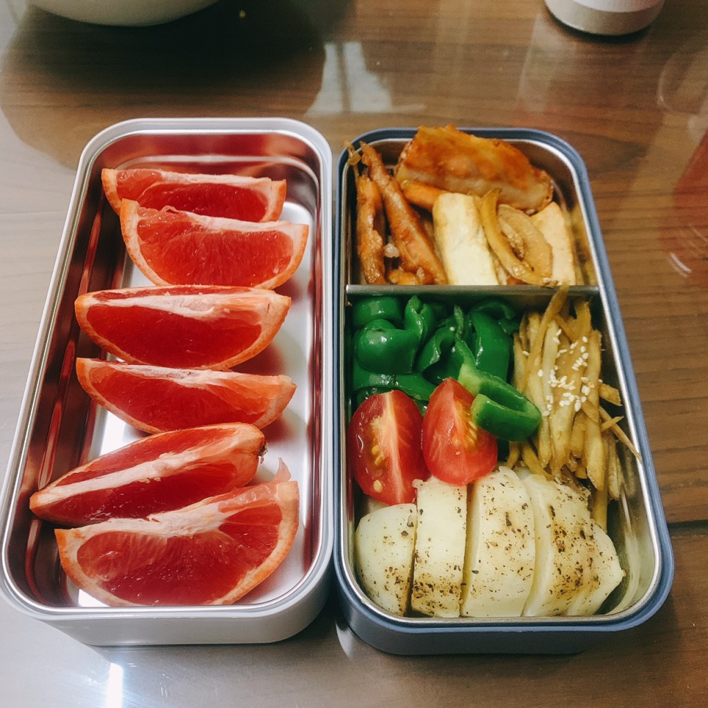 馬鈴薯削皮切塊,撒上鹽巴、黑胡椒放入電鍋後,加半米杯的水,等電鍋跳起來就可以放進便當盒了
