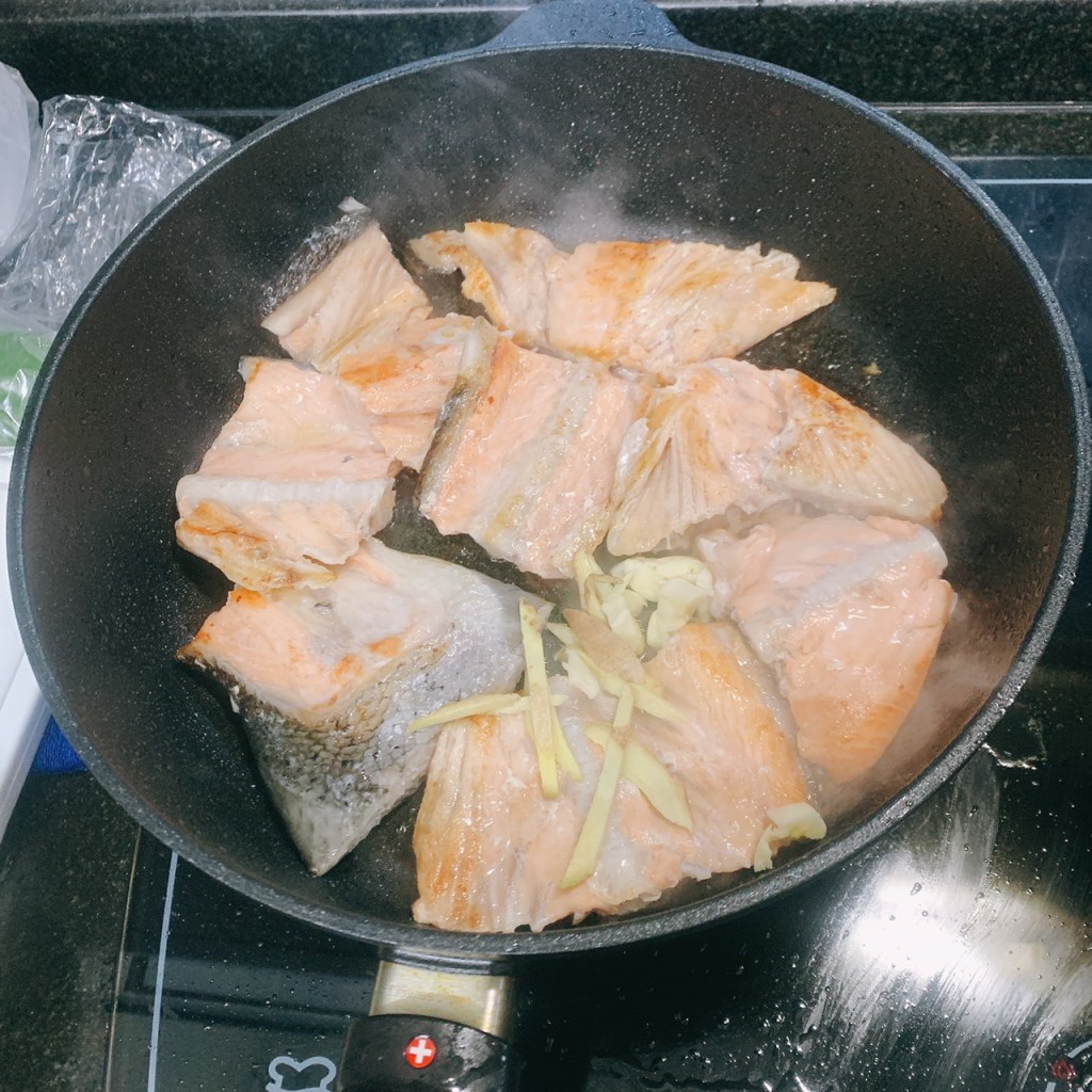 接著再用蒜頭、薑絲爆香,然後下帶骨鮭魚,鮭魚煎個五分鐘直到肉的表皮呈現粉色或者金黃色邊就可以將方才起鍋的百葉豆腐放下去。