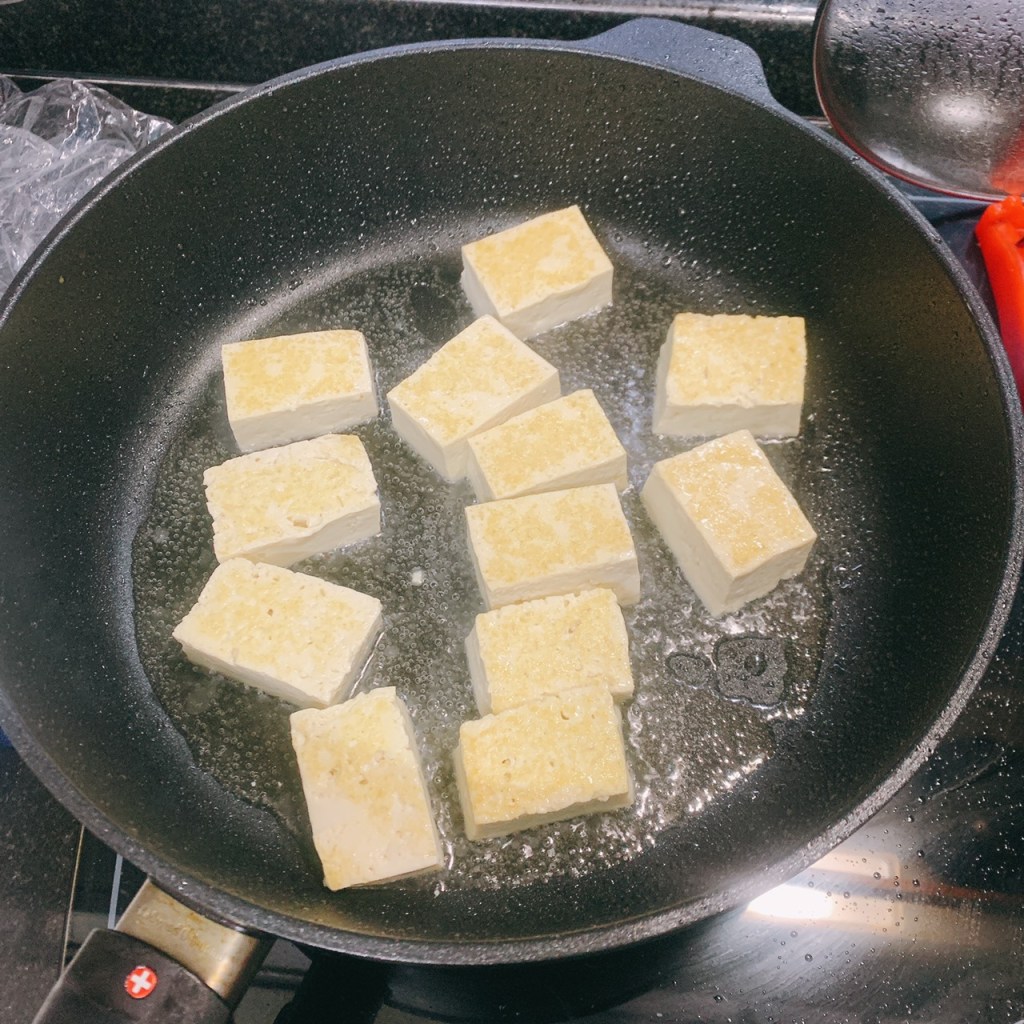 首先呢,先將百葉豆腐切片,下鍋油煎,不要急著翻,下鍋後可以蓋鍋蓋讓豆腐煎個三至五分鐘再翻面煎另一邊,直到豆腐表面呈金黃色,便能先盛盤放一邊。