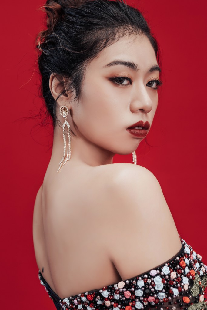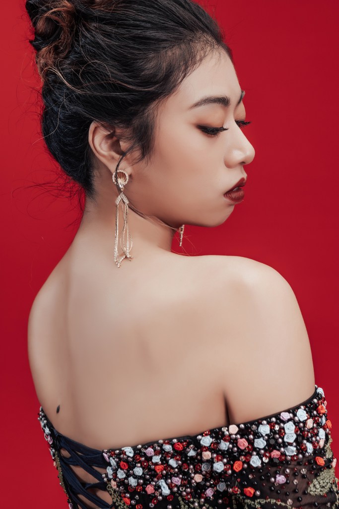 禮服上的植物刺繡配上身後的古典背景,不知為何就是有種不屬於我這個年紀的氣勢與肅氣。