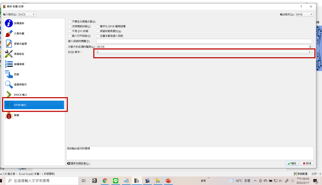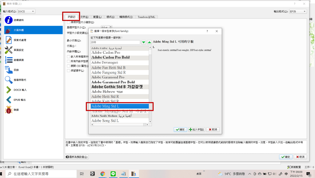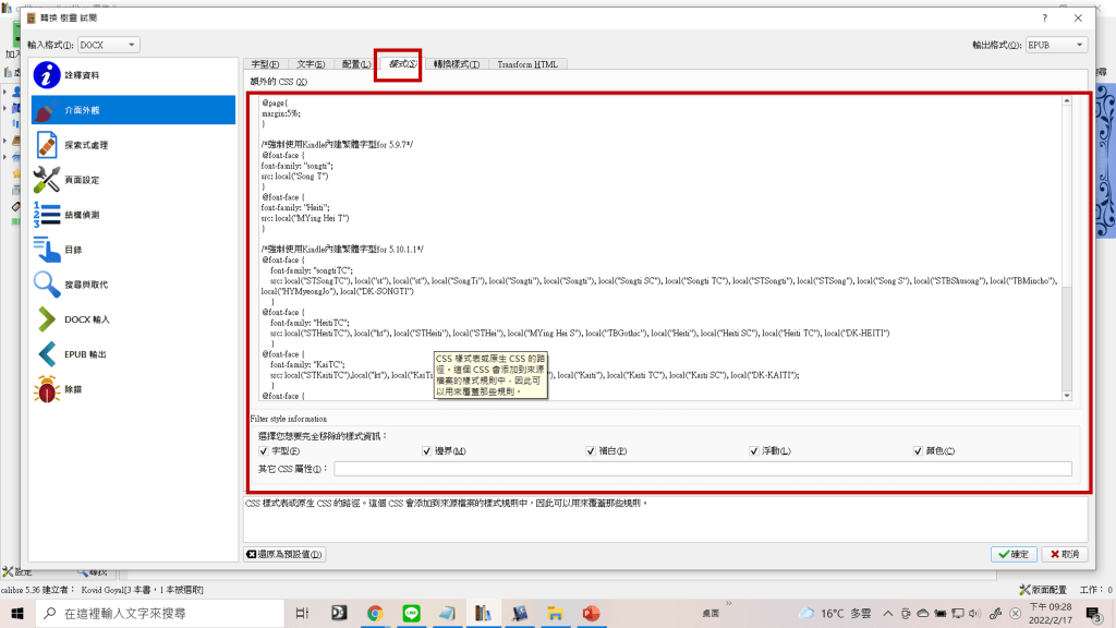 再來就是,樣式的「額外的CSS」空格裡要帶入這個語碼,然後把下面的字型、邊界、補白等等全部打勾,最後轉換成功後,電子書才會變成直式排版。