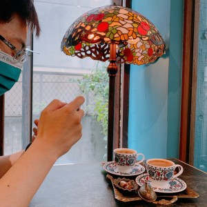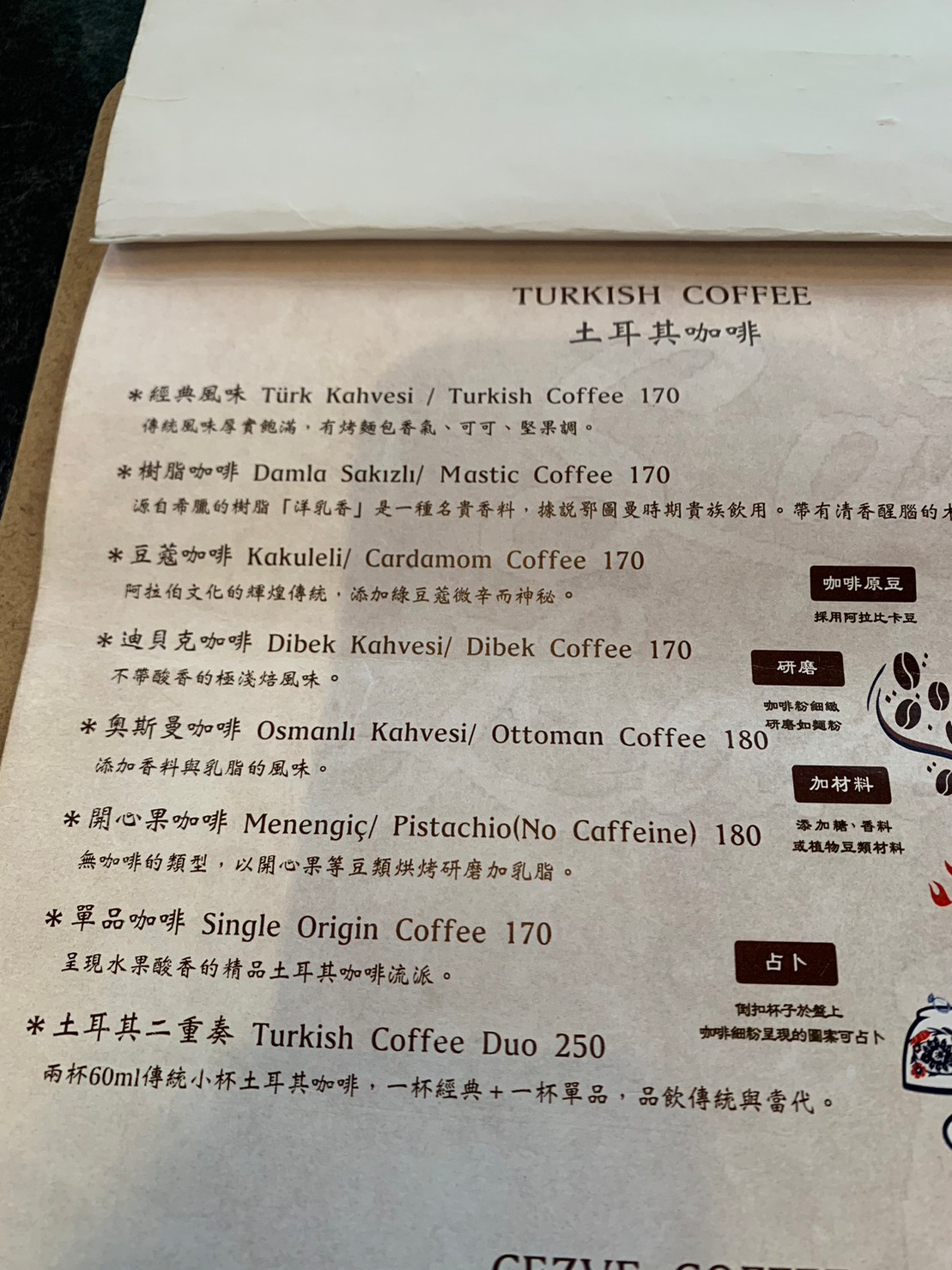 土耳其咖啡有趣的地方是,他是將咖啡粉研磨至很細很細,然後連同著咖啡粉與水一起煮,所以在品嘗時多是等咖啡涼一點、咖啡粉沉澱後才喝,也因為土耳其那裏的香料極多,所以香料咖啡也很多。
